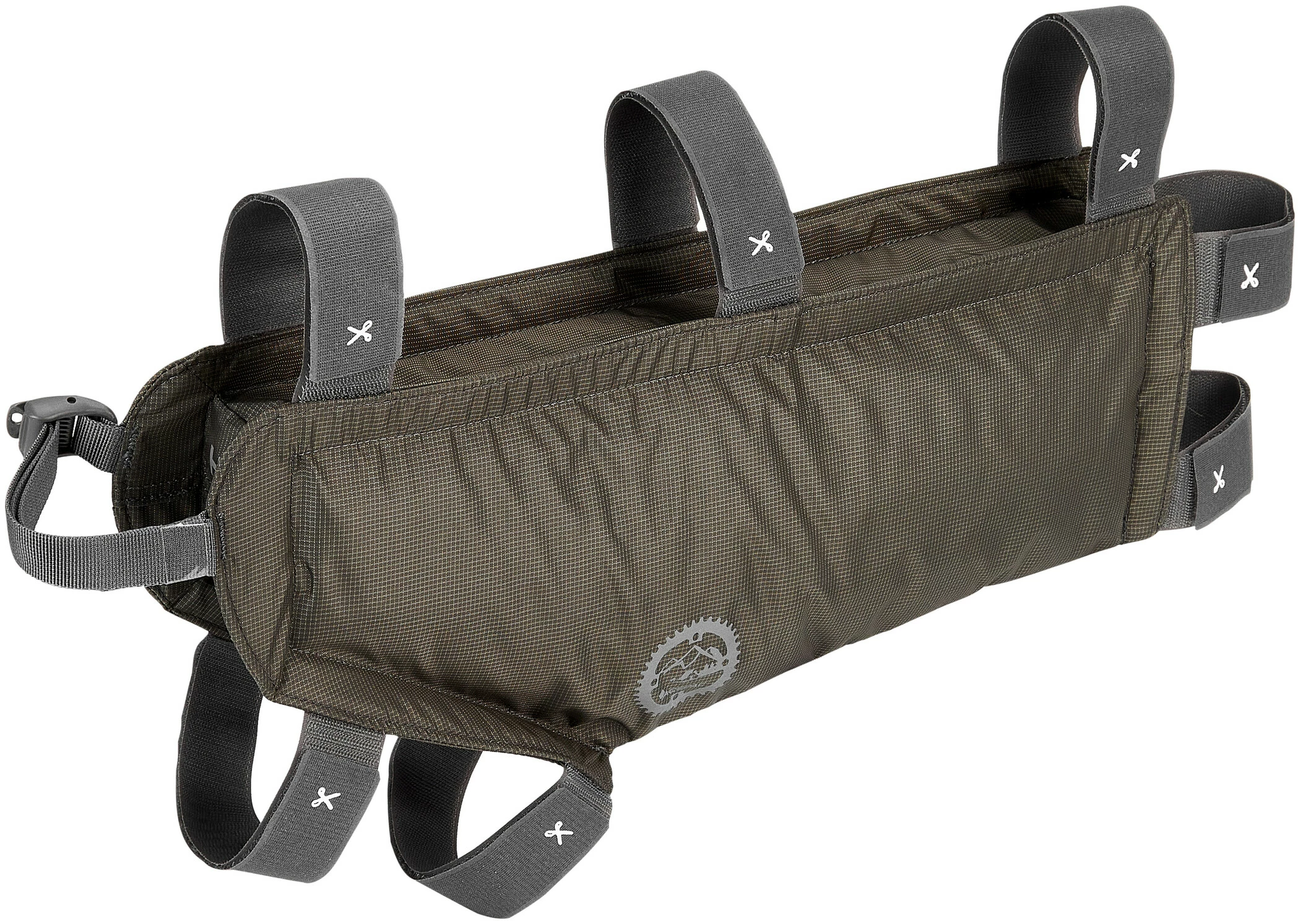 Die Rahmentasche wird in 2 Größen hergestellt, die sich in der Länge des Beutels unterscheiden (M = 40 cm und L = 48 cm ). Verwendetes Hauptmaterial: Nylon Ecomade Ripstop (PU-Beschichtung 1500 mm H 2 0), strapazierfähiges Gewebe. Die Tasche enthält einen herausnehmbaren wasserdichten Einsatz (beschichtet mit Nylon-Ripstop-Stoff, PU 5000 mm mit geklebten Nähten), der den transportierten Inhalt der Tasche garantiert trocken hält. Der Eingang zur Tasche ist mit einem V-Riemen aus Polypropylen mit einem Duraflex Xlite- Clip mit einfachem Zugang (-20 ° C) für eine einfache Bedienung (auch in Handschuhen) gesichert. Der Umfang der Tasche ist mit einem dickeren Nylon Ecomade-Material für eine höhere Abriebfestigkeit verstärkt und mit Schaumstoff gepolstert, damit die Tasche ihre Form gut beibehält und ihr Inhalt den Rahmen während der Fahrt nicht beschädigt. Die innere Seitenwand der Tasche ist mit einem markanten Futter und Netztaschen ausgestattet. Die Tasche wird mit 7 Klettbändern am Rahmen befestigt (diese müssen entsprechend Ihrem Rahmen auf die erforderliche Länge gekürzt werden). Im vorderen Teil der Tasche befindet sich ein Polypropylen-Armband mit einer Duraflex Camlok- Schnalle. An der gleichen Stelle (unter dem oberen Rahmenrohr) befindet sich ein Auslass am Schlauch. Verspannte Nähte werden mit dem sogenannten Bartack- Stich (Zickzack) gesichert. Alle verwendeten Garne sind aus Polyester mit einem großen Faserdurchmesser für maximale Festigkeit.