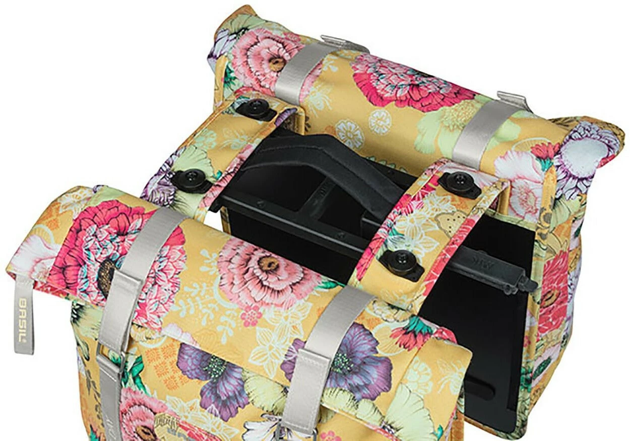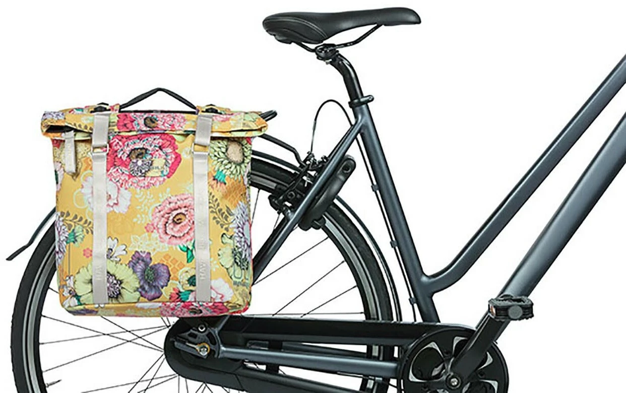 Mit der Basil Bloom Field entscheidest du dich für eine fröhliche und trendige doppelte Fahrradtasche auf deinem Gepäckträger. Hergestellt wurde die Tasche aus recyceltem PET-Kunststoff. Die Fahrradtasche ist außerdem wasserdicht (IPX3) und bietet mit einem Fassungsvermögen von 28 bis 35 Litern Platz für all deine Einkäufe und sonstigen Dinge. Die Bloom-Field-Doppeltasche ist ferner vollständig gefüttert und verfügt über einen wasserabweisenden Faltverschluss. Dadurch wird verhindert, dass Regenwasser in die Tasche eindringt. Mit diesen praktischen Eigenschaften bringst du deine Einkäufe trocken ins Ziel.