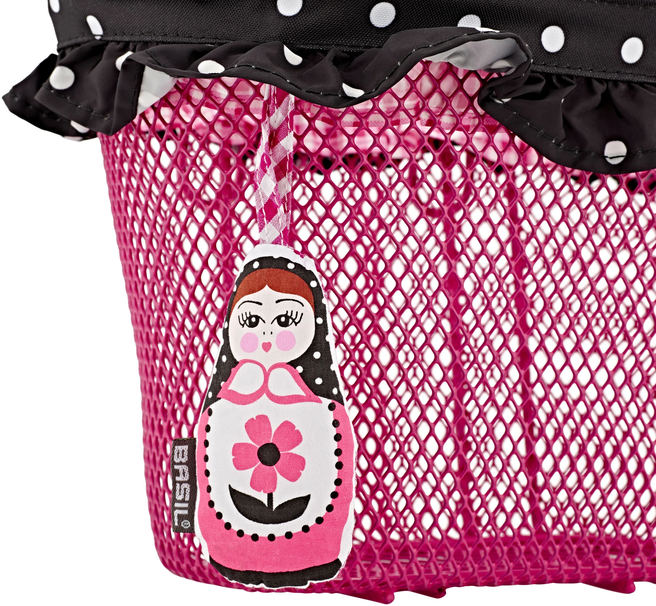 Der Basil Jasmin ist ein Fahrradkorb für die Vorderseite des Kinderfahrrades. Die Befestigung erfolgt mittels zwei Haken und ist ausgestattet mit einer bunten Dekoration Band, einer Babouschka Puppe und einem Tragegriff.