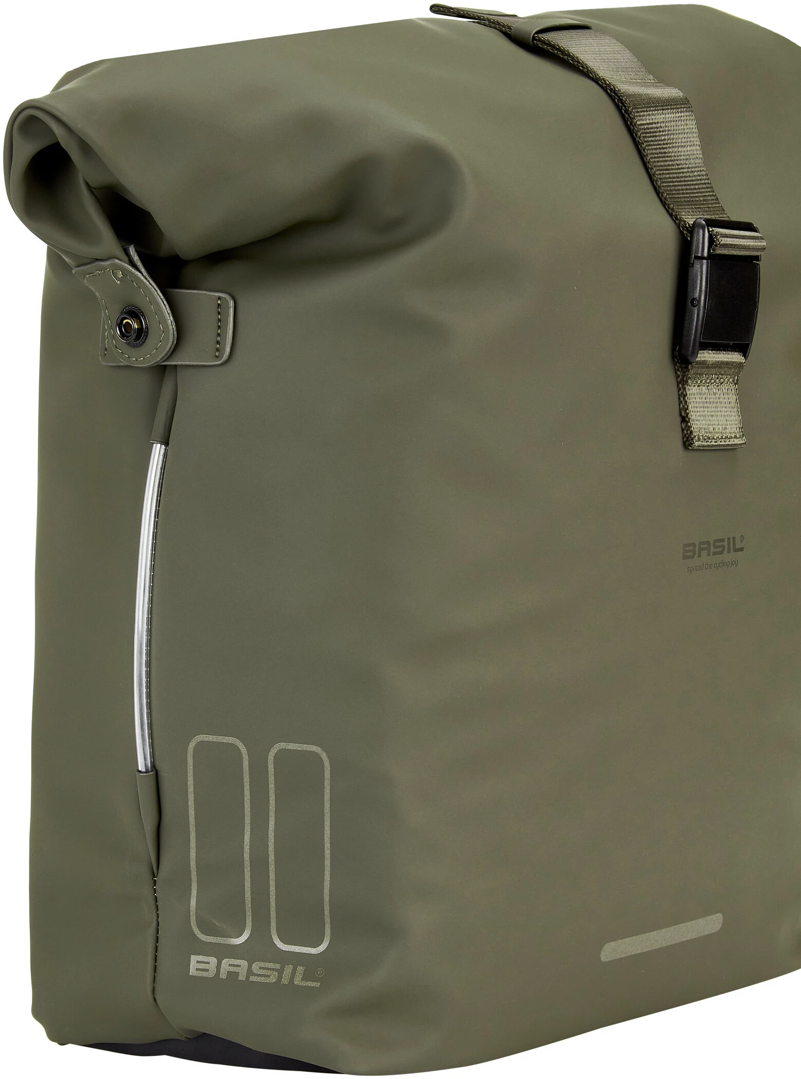 Auch an deine Sicherheit wurde gedacht. Die Tasche ist mit der Nordlicht Technology ausgestattet, einem integrierten LED-Streifen. Dadurch fällst du in der Dunkelheit besser auf. Die LED-Beleuchtung funktioniert mit 3 AAA-Batterien (nicht im Lieferumfang enthalten). Hast du viele und schwerere Sachen in deiner Tasche? Dann kannst du die Tasche mit dem Basil Abstandshalter (nicht im Lieferumfang enthalten) kombinieren. Dieser Halter verhindert, dass die Tasche in die Speichen deines Fahrrads gelangt.