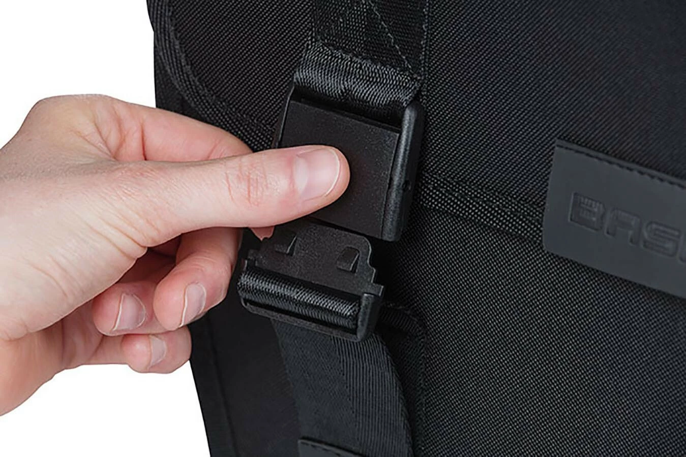 Mit dem Universal Bridge System befestigst du die Taschen an deinem Rad. Das Befestigen funktioniert mit den vormontierten Riemen oder in der Kombination mit dem Basil DBS System (abnehmbare Gepäckträgerplatten) oder mit einer Adapterplatte wie MIK. Diese beiden Systeme müssen gesondert gekauft werden. Hast du viele, schwere Sachen in deiner Tasche? Dann kannst du die Tasche mit dem Basil Abstandshalter (separat erhältlich) kombinieren. Dieser Halter verhindert, dass die Tasche in die Speichen deines Fahrrads gerät.
