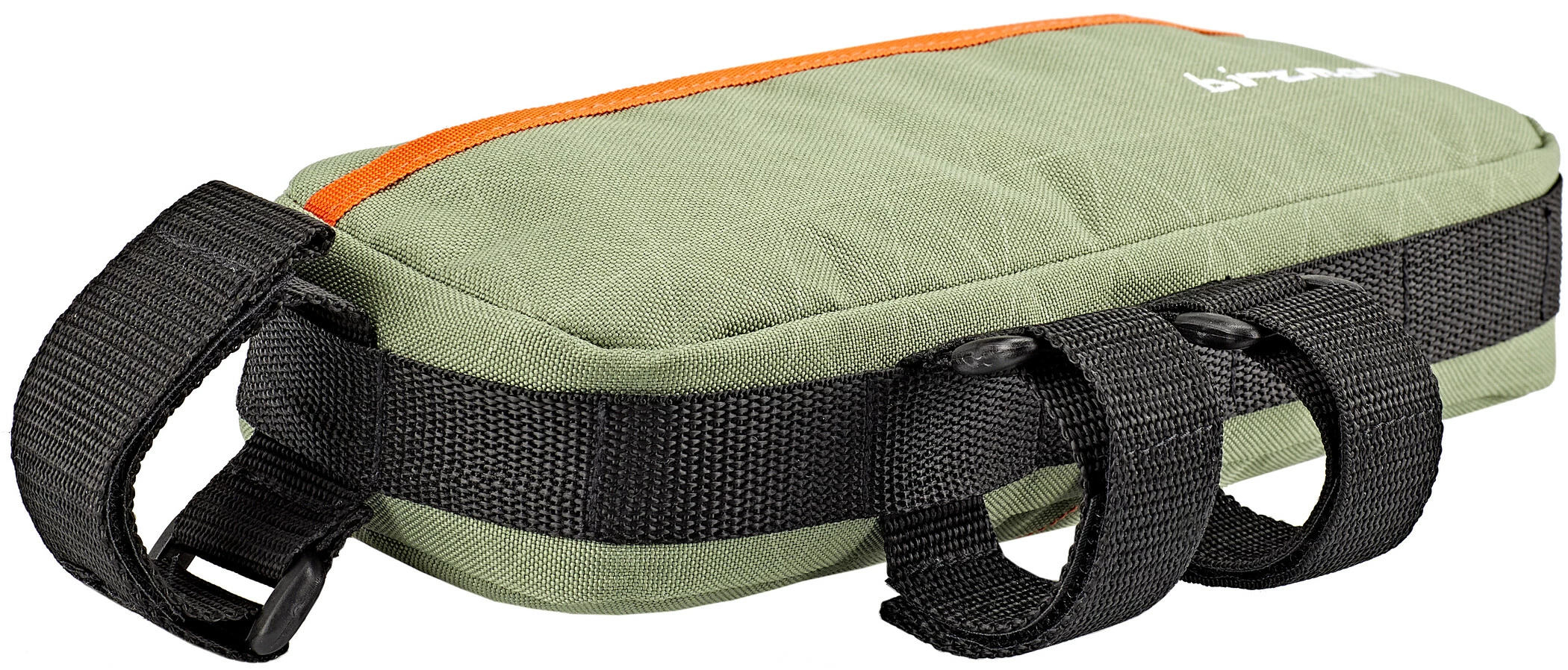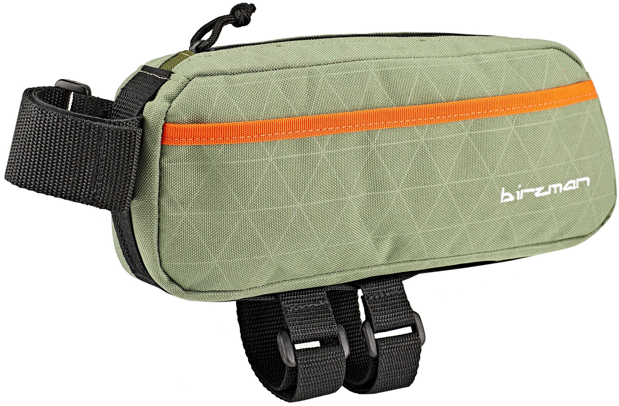 Diese strapazierfähige Tasche ist wasserabweisend und spritzwasergeschützt. Sie wird mit Velcro-Straps am Oberrohr befestigt und verfügt über ein Innenfach und drei Außentaschen.