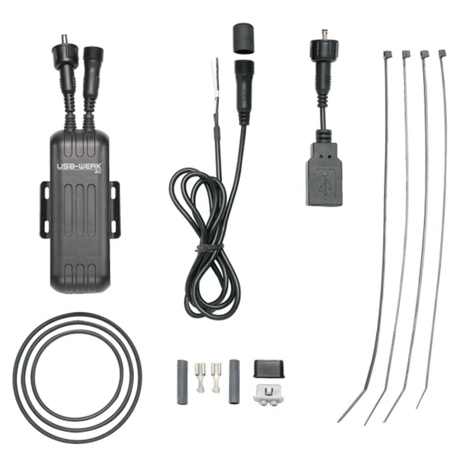 Das USB-WERK wird am Nabendynamo angeschlossen und macht die Energie nutzbar, indem es 5 V Spannung und bis zu 500 mA Stromstärke abgibt. Ein integrierter, kleiner Pufferakku stellt sicher, dass auch bei langsamer Fahrt und kurzen Stopps die Spannungsversorgung konstant bei 5 V bleibt. Das USB-WERK ist damit bestens geeignet zum Laden/Betreiben von USB-Geräten aller Art: Mobiltelefon, GPS, MP3-Player etc. Enthält Ausgangskabel mit USB-Buchse.