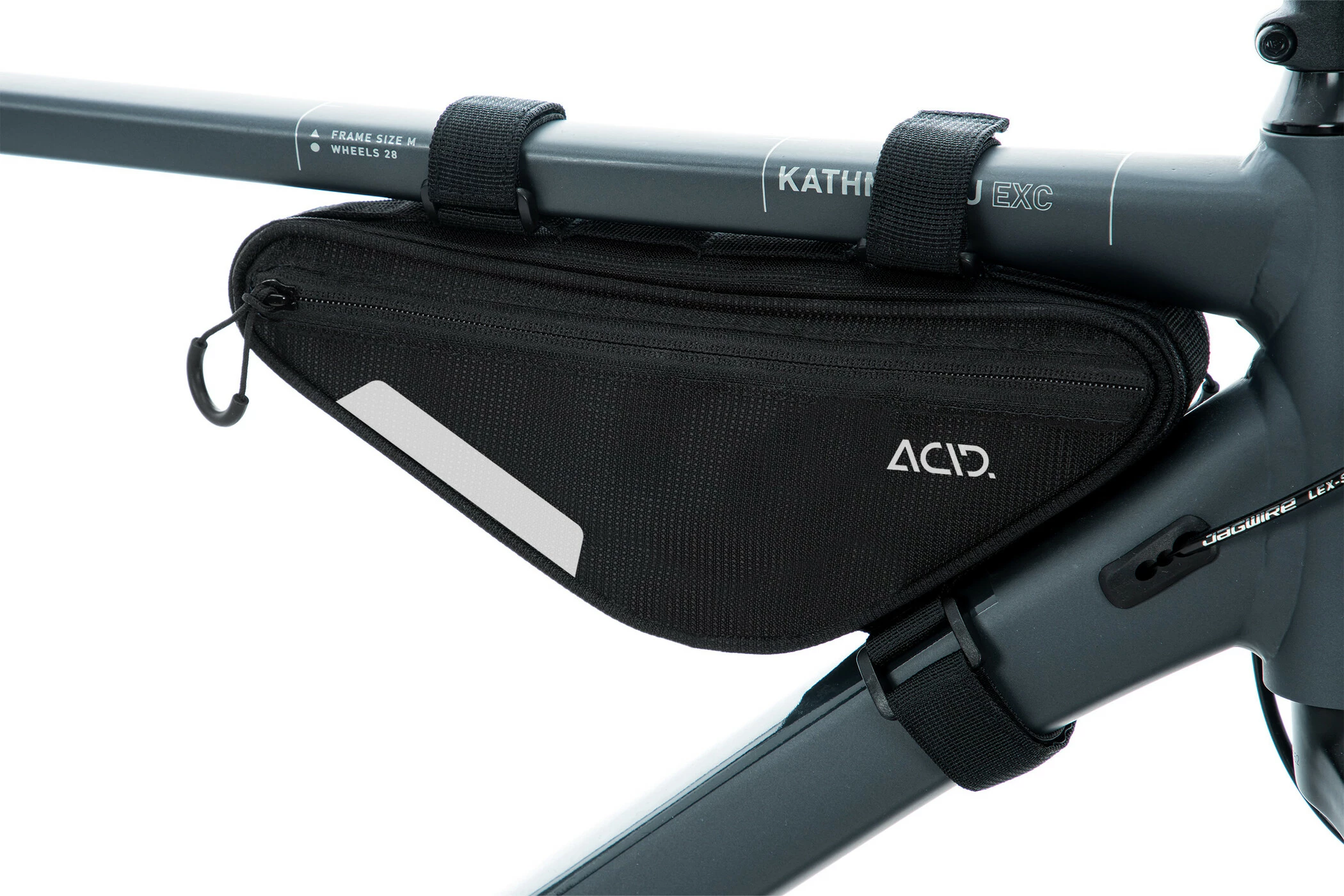 Die ACID Rahmentasche CMPT 1 mit 1 Liter Fassungsvermögen hat alle essenziellen Features, die sie braucht. Das Außenmaterial ist PVC-frei, abriebfest und pflegeleicht. Dank dem umlaufenden Molle-System lässt sie sich mit Straps an verschiedenen Positionen anbringen und passt sich flexibel an den Rahmen an, ohne die Bike-Performance zu beeinträchtigen.