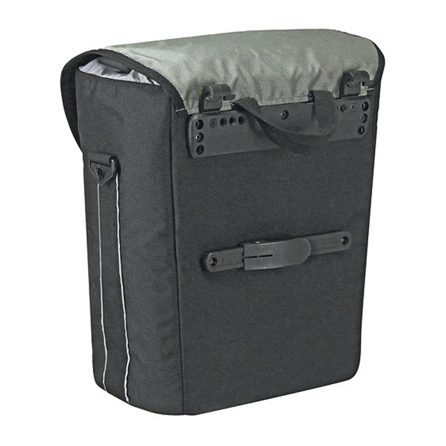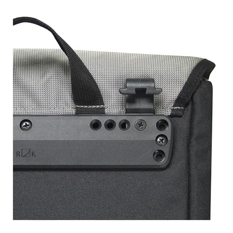 Am Gepäckträgeradapter lässt sich die Tache mit den schwarzen Haken in die seitlichen Schlitze einrasten, abschließen und mit Boxen, Topcases oder Körben kombinieren. Im Lieferumfang sind zusätzlich Haken mit blauem Riegel für Standardträger 6-12 mm. Verwendet man die Haken mit blauem Riegel benötigt man keine Gepäckträger-Adapterplatte, kann die Tasche dann aber nicht mit Topcases etc. kombinieren oder abschließen. Die untere Schiene verhindert seitliches Pendeln der Tasche. Bei Bedarf finden Sie den Gepäckträger-Adapterplatte in den Sortiment.