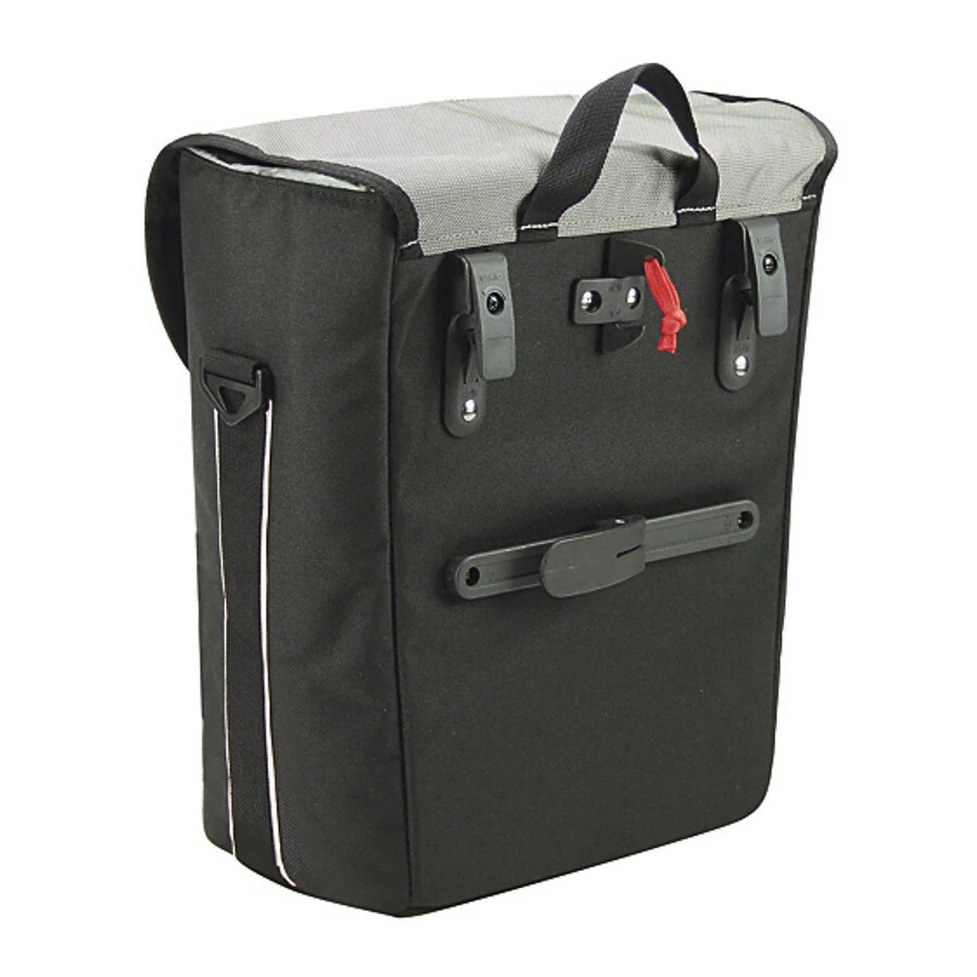 Flotte Einkaufstasche mit Vortasche und zusätzlichem Fach in der Taschenklappe für Schlüssel oder Geldbörse. Breiter abnehmbarer Umhängegurt. Erweiterbarer Stauraum mit Kordelzug. Mit 2 Variohaken, einstellbar für Standardgepäckträger 6-16 mm Durchmesser. Die Tasche ist rechts- und linksseitig verwendbar und daher einzeln erhältlich.