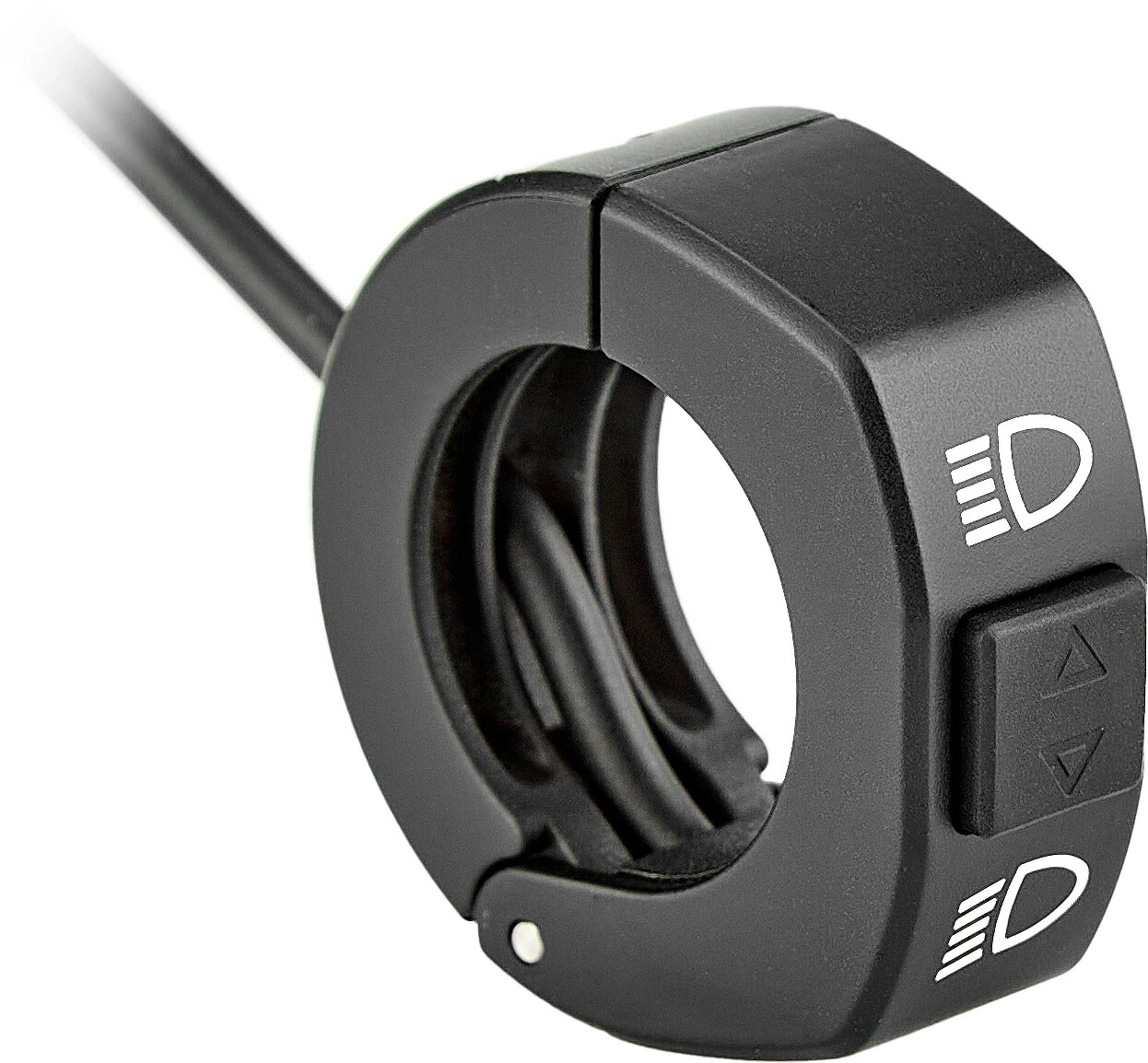 Mit der speziell für E-Bikes entwickelten Tasterschelle hast du deine Lampe stets im Griff und wechselst kinderleicht zwischen Abblendlicht und Fernlicht. Die Symbole des Tasters leuchten Grün oder Blau, je nachdem in welchem Modus du dich gerade befindest.