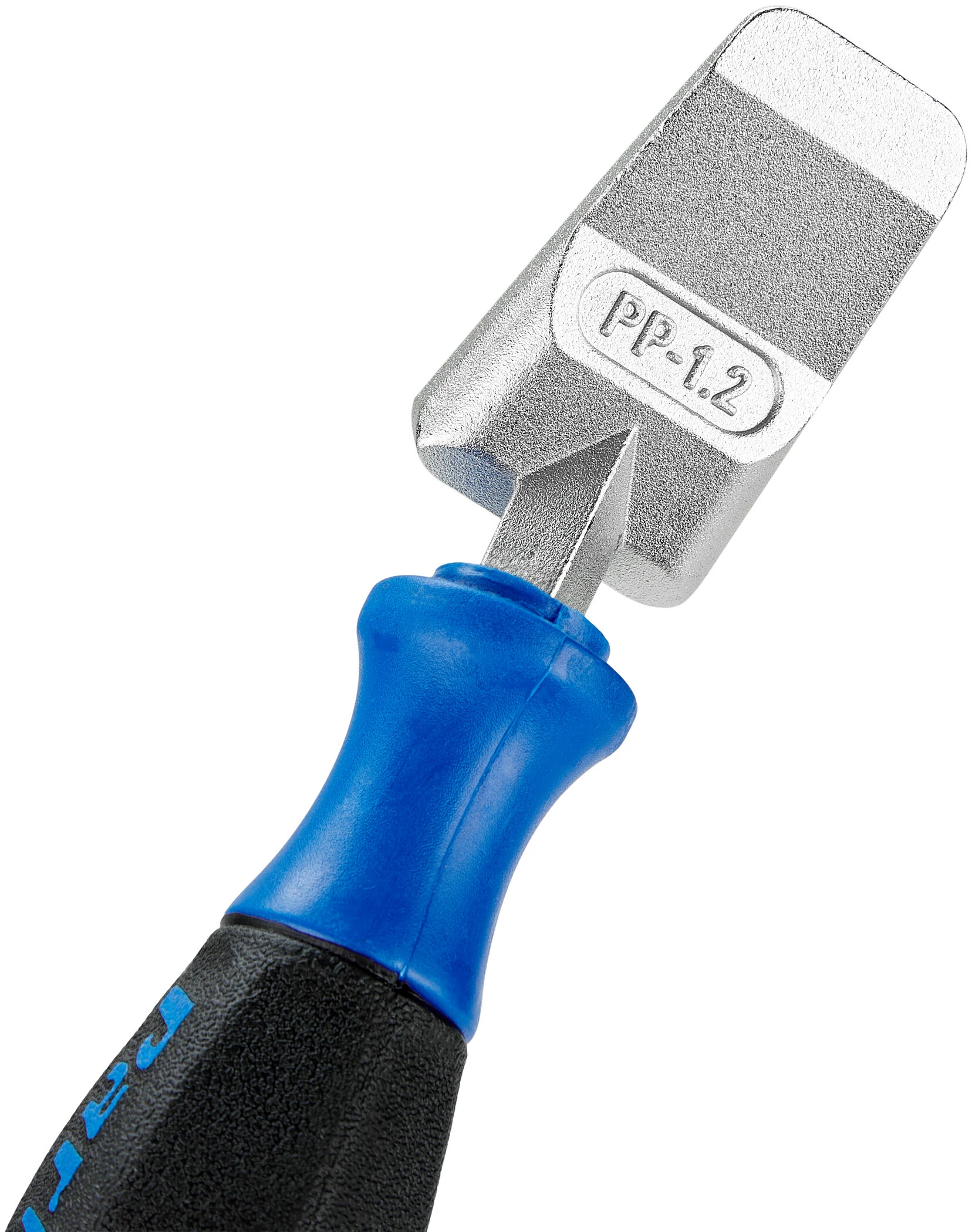 Mit dem speziell geformten PP-1.2 lassen sich zur Beschleunigung von Wartung und Belagwechsel die Bremszylinder zusammendrücken. Einfach das polierte, keilförmige Werkzeug zwischen die Bremsbeläge schieben, um deren Abstand zu vergrößern und die Zylinder im Bremssattel optimal zu positionieren. Jetzt in etwas schmalerer Ausführung als das Original PP-1 und damit für noch mehr Bremsenmodelle passend.