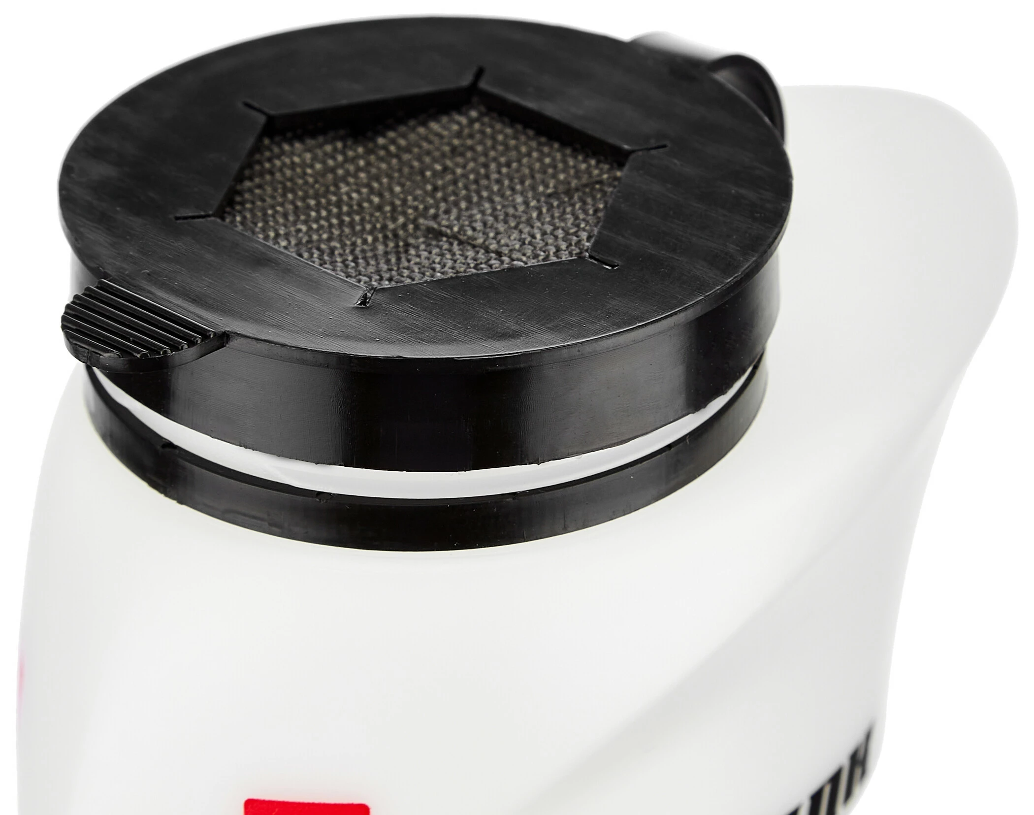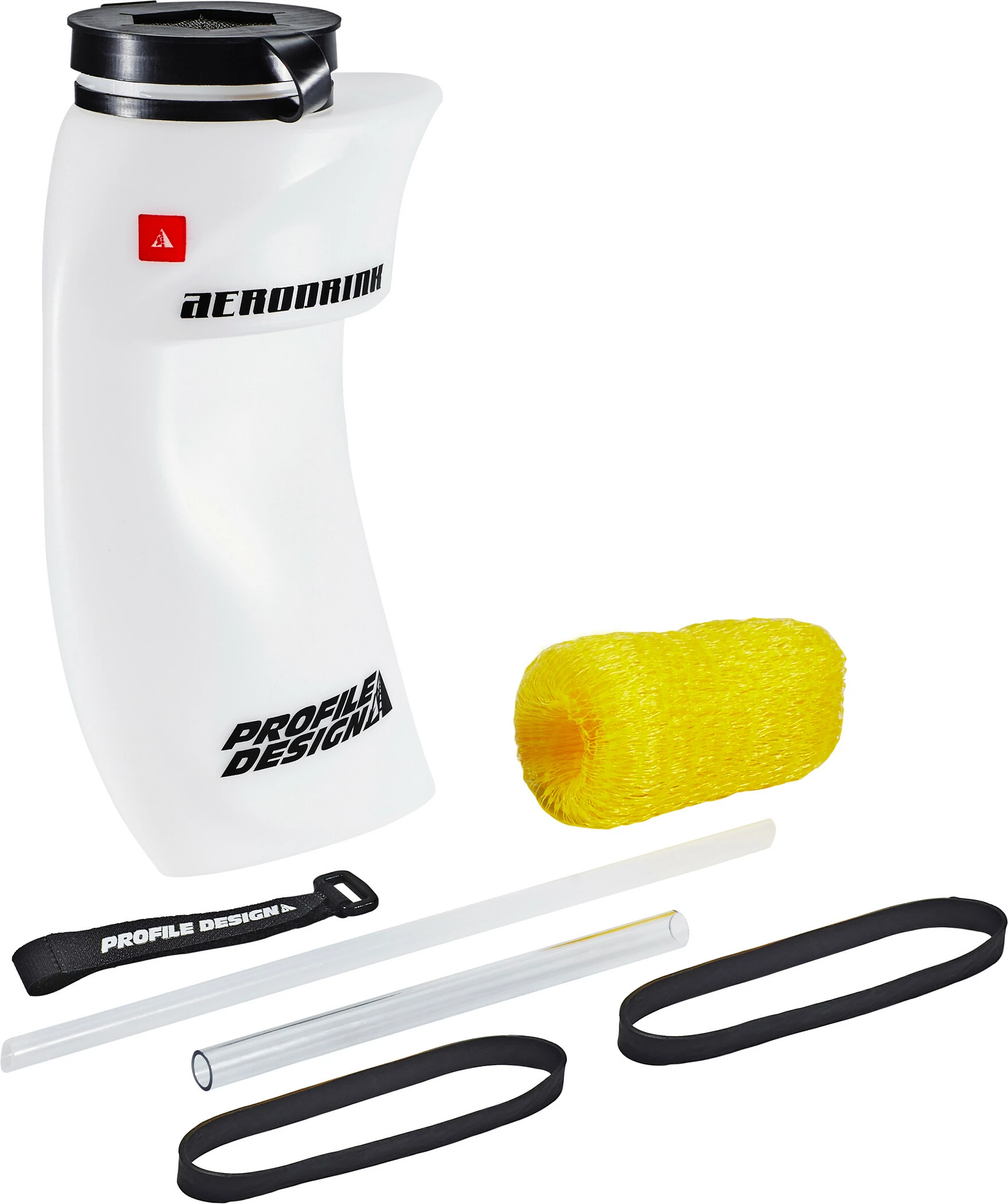 Aerodynamisches Trinksystem, das Trinken auch während der Aeroposition ermöglicht. Die Flasche ist nur durch ein Netz verschlossen, so dass während der Fahrt schnell nachgetankt werden kann, ohne dassdie Flüssigkeit rausschwappt. Durch den Gummiring ist es für fast alle Aerolenker passend.