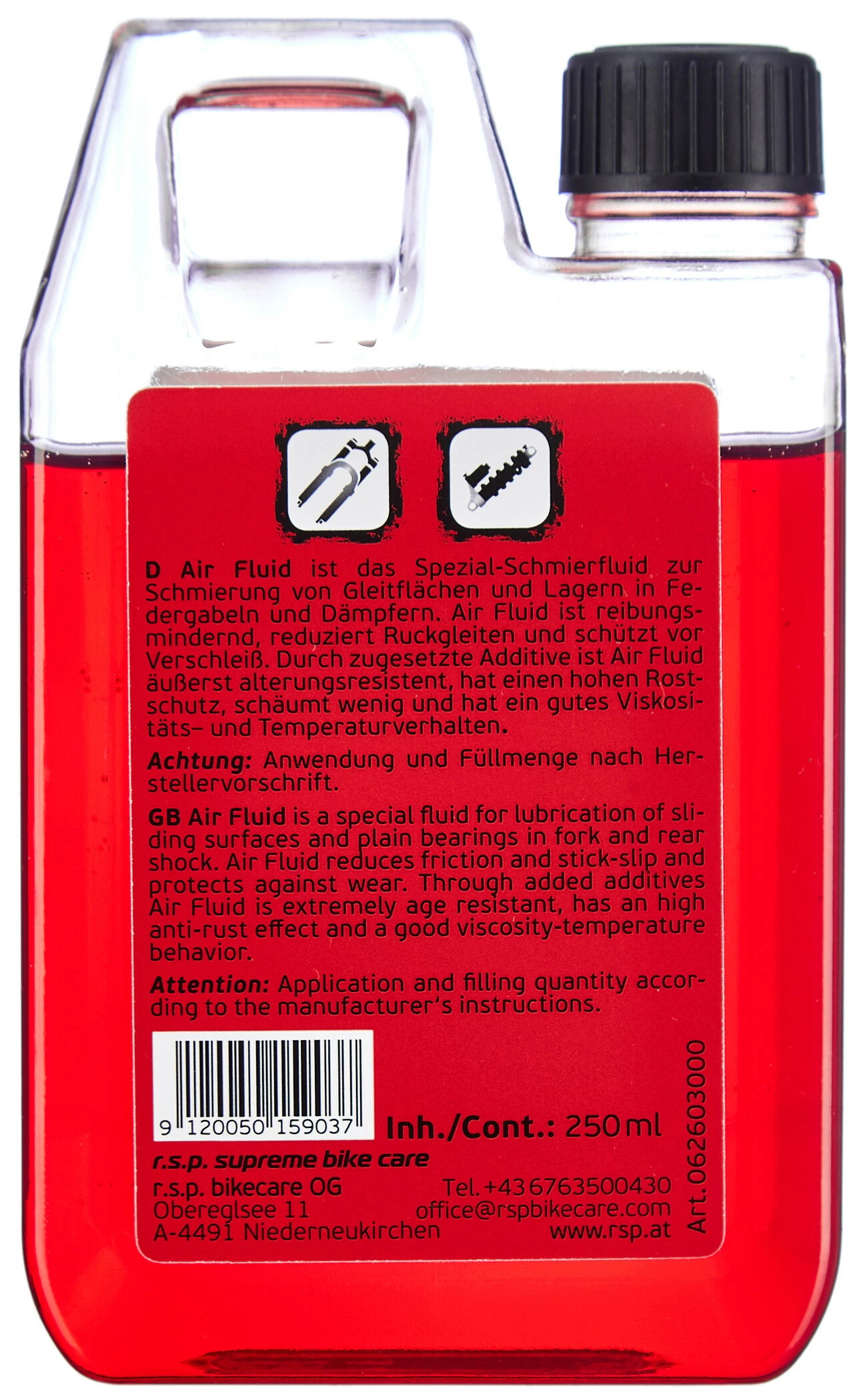 Das Air Fluid ist das Spezial-Schmierfluid zur Schmierung von Gleitflächen und Lagern in Federgabeln und Dämpfern. Air Fluid ist reibungsmindernd, reduziert Ruckgleiten und schützt vor Verschleiß. Durch zugesetzte Additive ist Air Fluid äußerst alterungsresistent, hat einen hohen Rostschutz, schäumt wenig und hat ein gutes Viskositäts- und Temperaturverhalten.