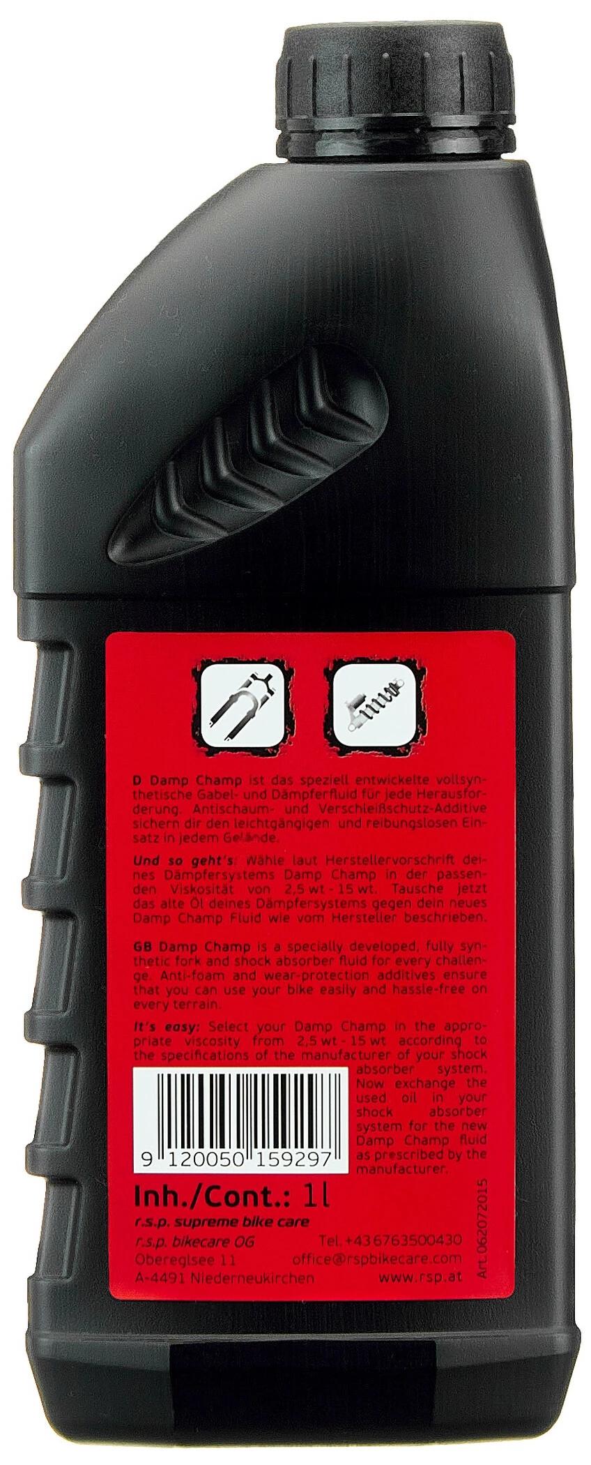 Wähle laut Herstellervorschrift deines Dämpfersystems Damp Champ in der passenden Viskosität von 2.5 WT – 15 WT. Tausche jetzt das alte Öl deines Dämpfersystems gegen dein neues Damp Champ Fluid wie vom Hersteller beschrieben. Erreiche das Maximum mit deinem Dämpfersystem und schmiere die vom Hersteller beschriebenen beweglichen Teile und Dichtungen mit r.s.p. Slick Kick. Damp Champ ist langlebig und schafft höchste Performance für deine Dämpfer. Schütze unsere Umwelt und recycle das Altöl.