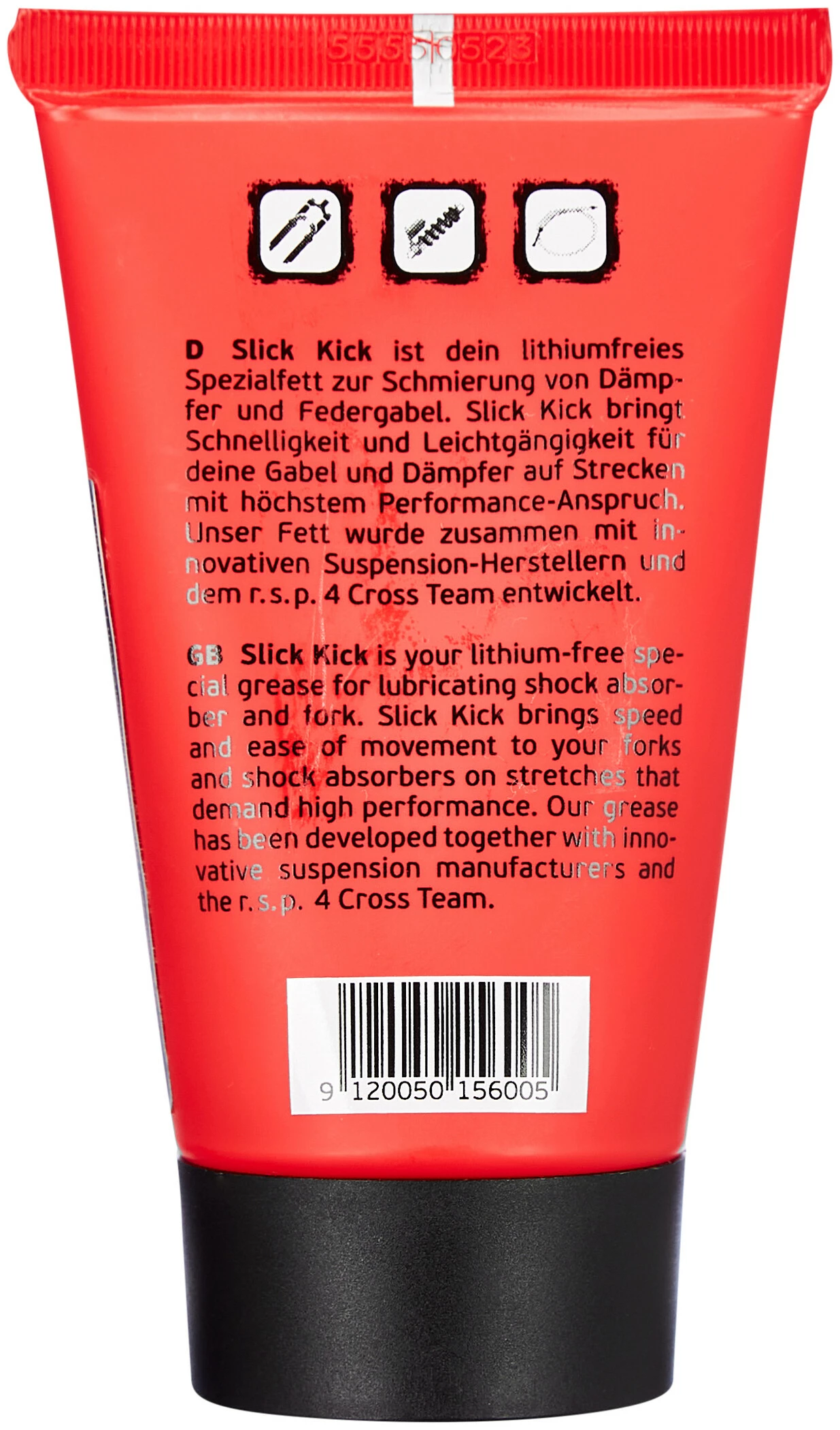 Slick Kick ist dein lithiumfreies Spezialfett zur Schmierung von Dämpfern und Federgabeln. Slick Kick bringt Schnelligkeit und Leichtgängigkeit für deine Gabel und Dämpfer auf Strecken mit höchstem Performance-Anspruch. Der Fett wurde zusammen mit innovativen Suspension-Herstellern und dem r. s. p. 4 Cross Team entwickelt.