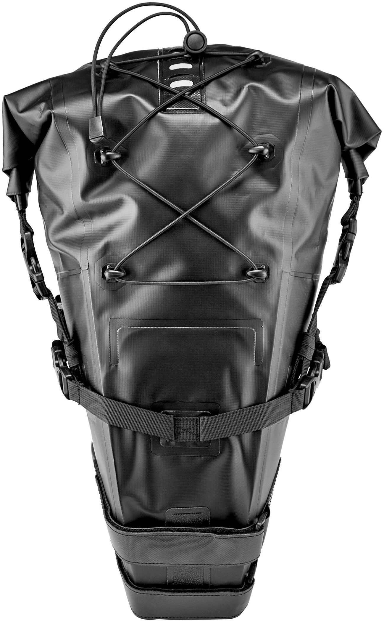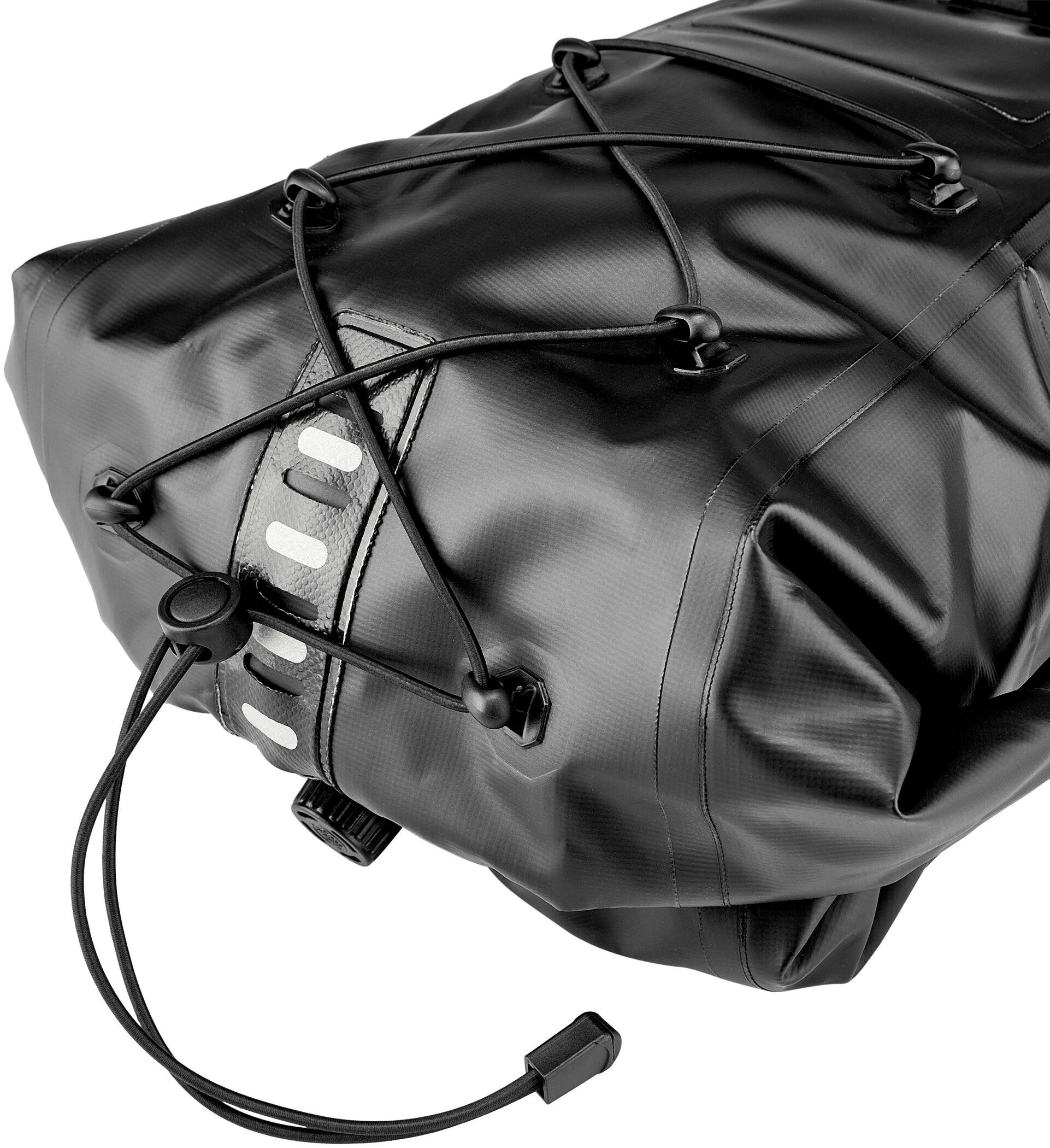Mit dieser Sattelstützentasche von Red Cycling Produkts steht deiner Bikepacking-Tour nichts mehr im Wege. 13 Liter Fassungsvermögen erlauben schon eine ordentliche Zuladung, beispielsweise deiner Wechselkleidung auf Reisen. Wasserdicht ist die Tasche auch, sodass du keinen separaten Drybag mehr brauchst. Die Tasche lässt sich mit einstellbaren Klettriemen an der Sattelstütze und den Sattelstreben sicher befestigen, damit sie während der Fahrt nicht schaukelt. Solltest du weniger mitnehmen wollen, kannst du die Tasche mit dem Rollverschluss an das Packvolumen anpassen und zusätzlich per Ventil die überschüssige Luft ablassen. An der Außenseite gibt es ein Befestigungssystem für ein Rücklicht, für das nach Anbringen der Sattelstützentasche oft kein Platz mehr an der Sattelstütze ist. Ein oben auf der Tasche angebrachter, justierbarer Spanngurt erlaubt dir, zusätzlich Gegenstände zu befestigen, wie beispielsweise ein Paar Badelatschen oder Kleidung, die du während der Fahrt trocknen möchtest.
