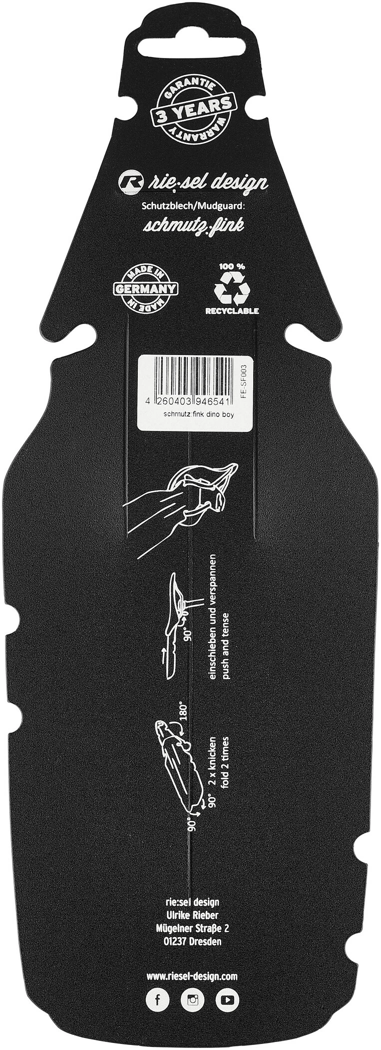 Die Form des Mudguards wurde speziell an die Anforderungen moderner Gestelle an Kindersätteln entwickelt und optimiert. Spezialfarben für die Grafiken und ein zusätzlicher Lack schützen dauerhaft vor widrigen Einflüssen. Das Design der „rit:ze L“ ist somit äußerst kratzfest. Der riesel design „schmutzfink“ wurde für den Spritzschutz im Heckbereich entwickelt. Die Montage erfolgt werkzeugfrei am Sattel zwischen den Sattelstreben.