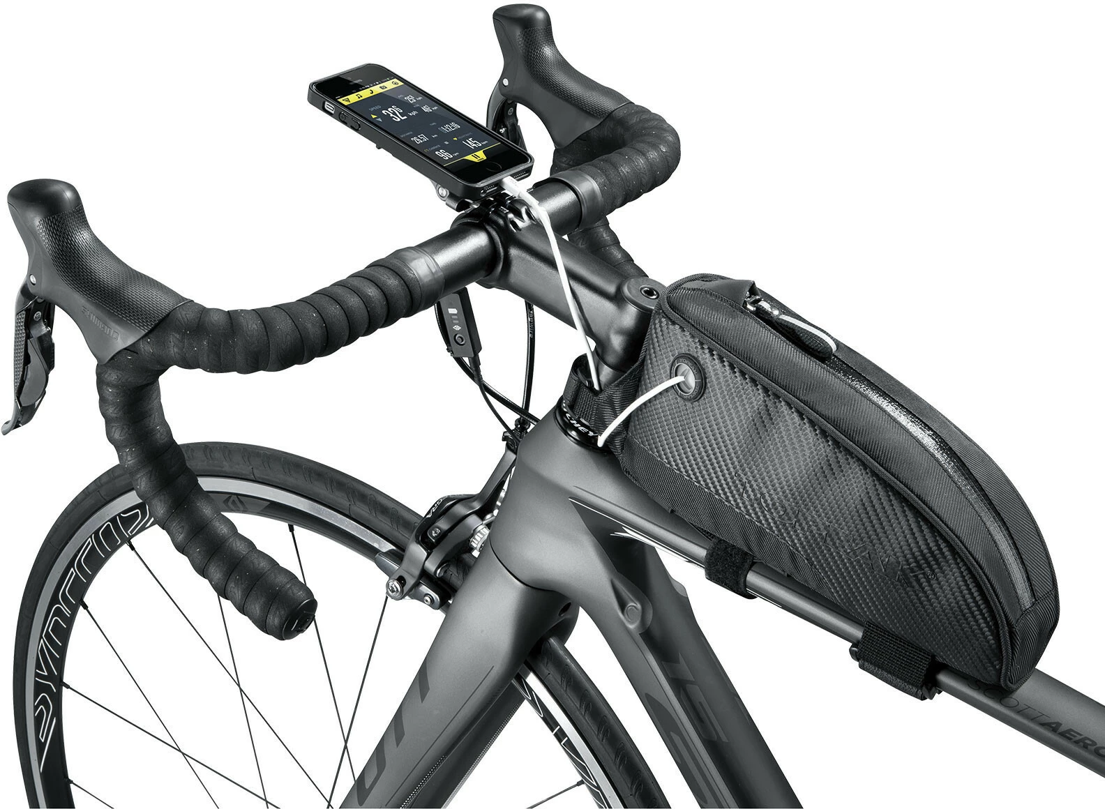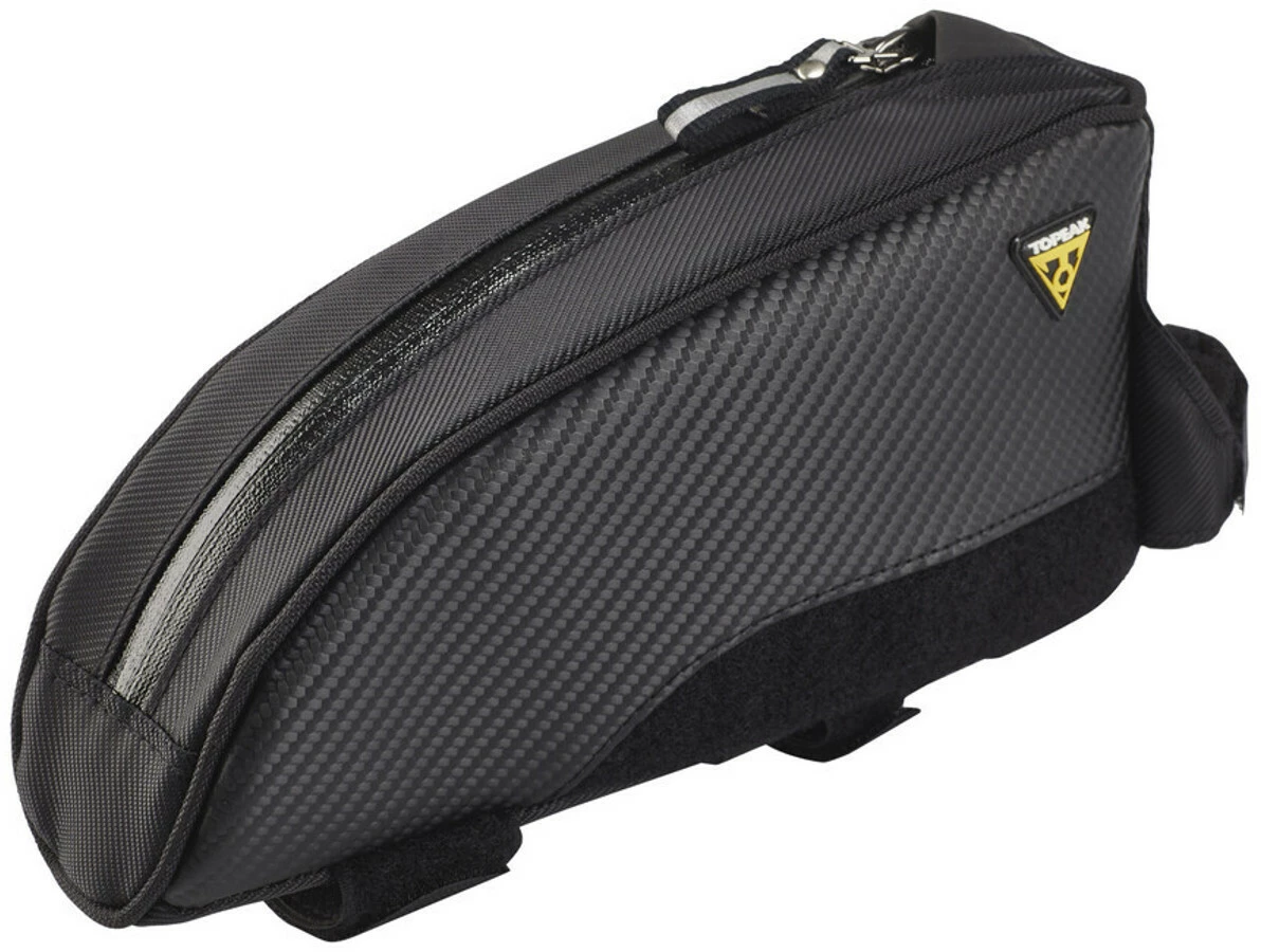 Großvolumige Oberrohrtasche für schnellen und leichten Zugriff auf Energieriegel, Handy, Geldbörse oder weiteres Zubehör, welches stets zur Hand sein muss. Durch eine gummierte Kabelöffnung können elektronische Geräte während der Fahrt außerhalb der Tasche geladen werden.