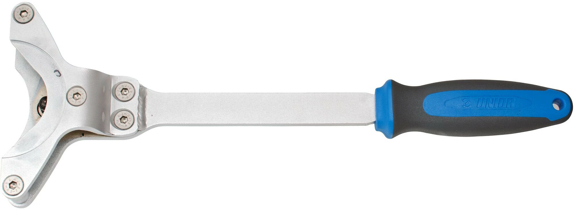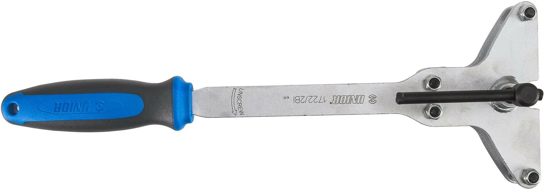 Das Wechseln eines Nabenritzels mit Gewindeaufnahme kann ein zeitaufwändiger Vorgang sein. Mit dem Unior 1722/2BI kann das Ritzel von beiden Seiten fest gegriffen werden, wobei die fest fixierte Spindel vom Ritzel an eine Seite gedrückt wird. Die Spindel und die Seitenführungen erzeugen einen starken Halt. Durch das Drehen des Werkzeugs gegen den Uhrzeigersinn wird das Ritzel gelöst.