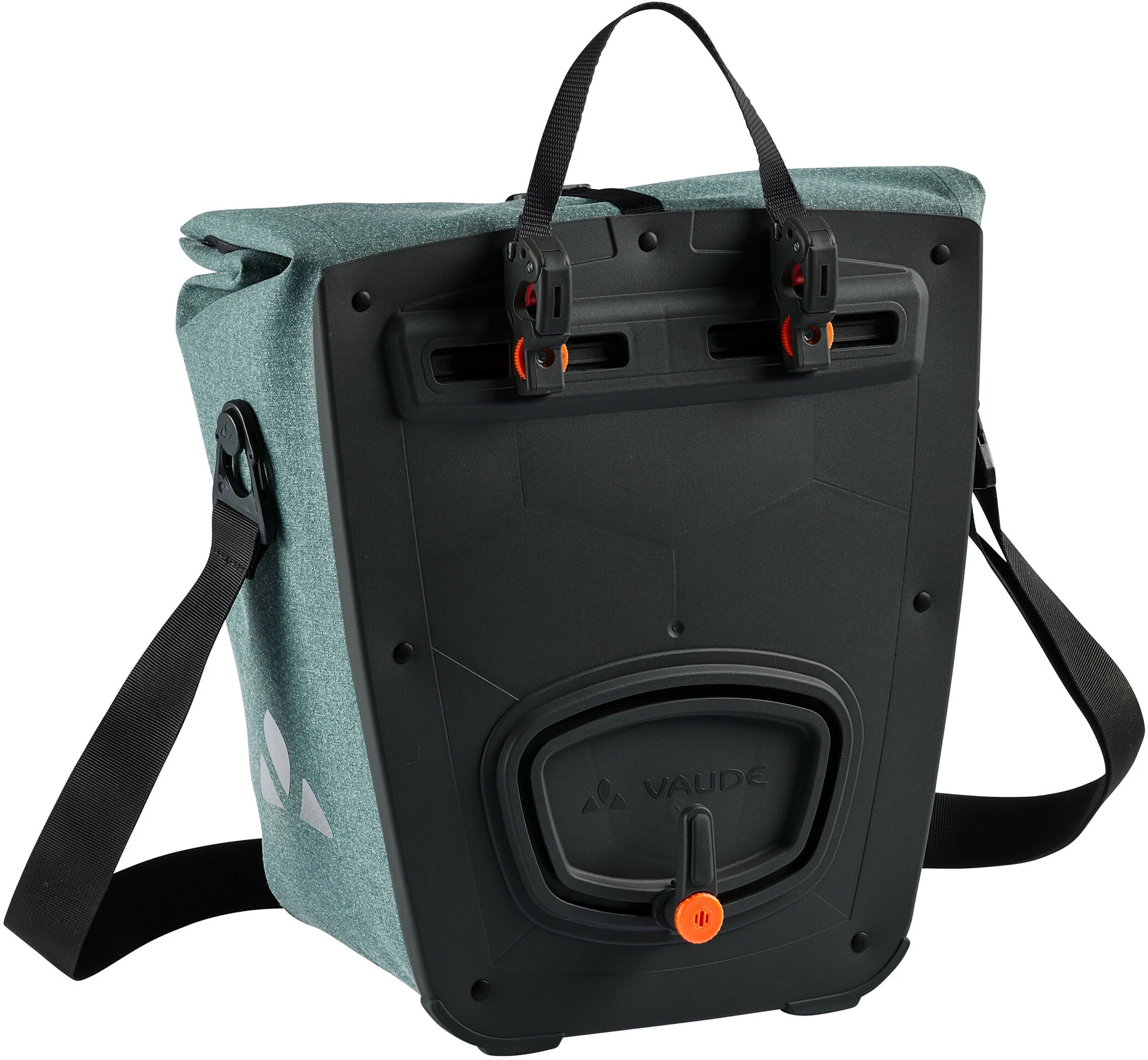 Die stylishe Tasche im Shopper-Design kommt mit stabilen, weich mit Polyesterband überzogenen Griffen, einem Rundhalsausschnitt für einen vergrößerten Eingriff und einem Staubalg zur besseren Fixierung des Inhaltes. Der abnehmbare Schultergurt und reflektierende Logos runden die Ausstattung ab. Die Tasche ist Bestandteil des Made in Germany Sortimentes von Vaude. Mit einem kleinen Bügelschloss (z. B. Abus 145/20) kann die ReCycle Back direkt am QMR-Haken verriegelt werden.