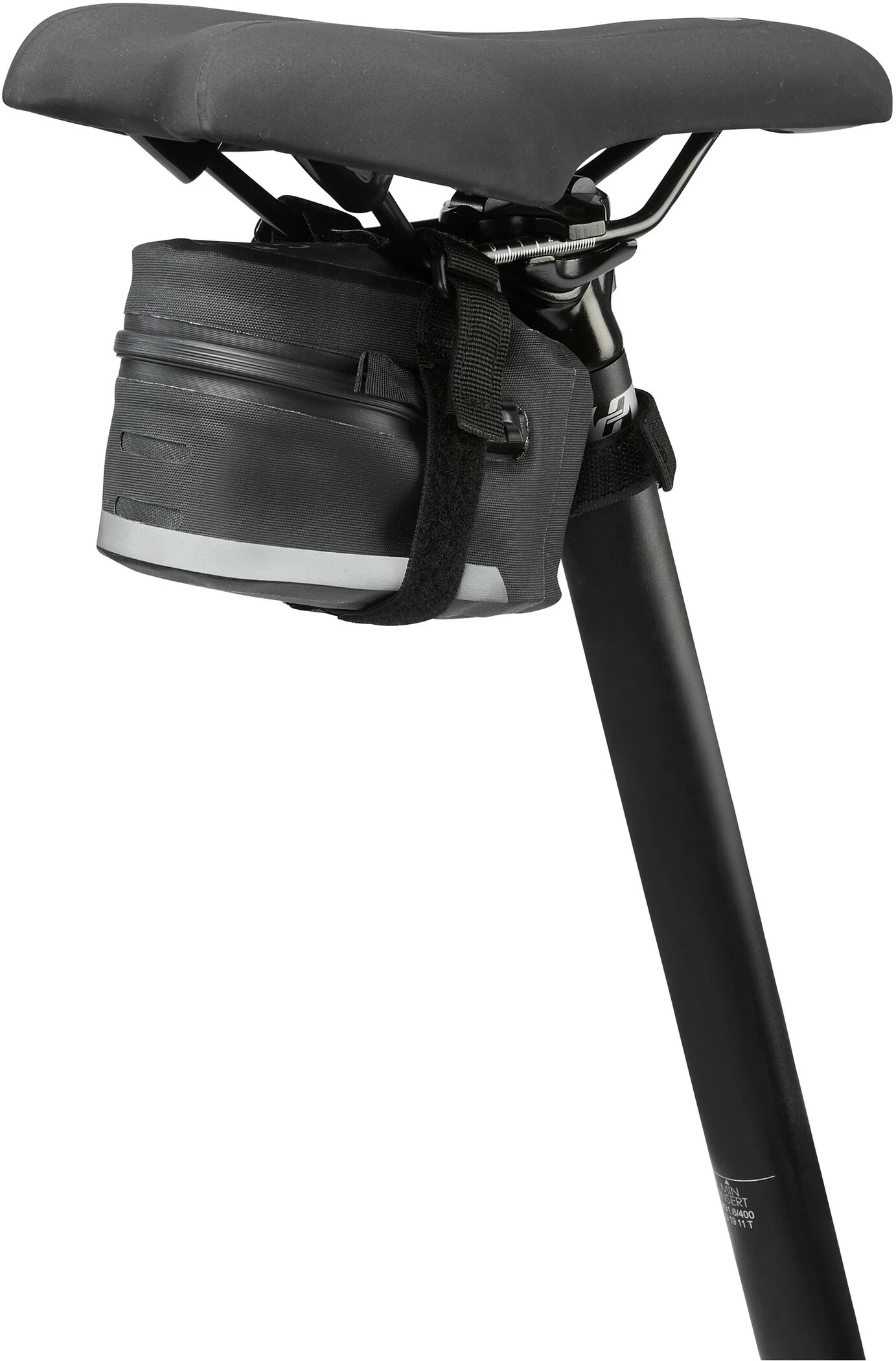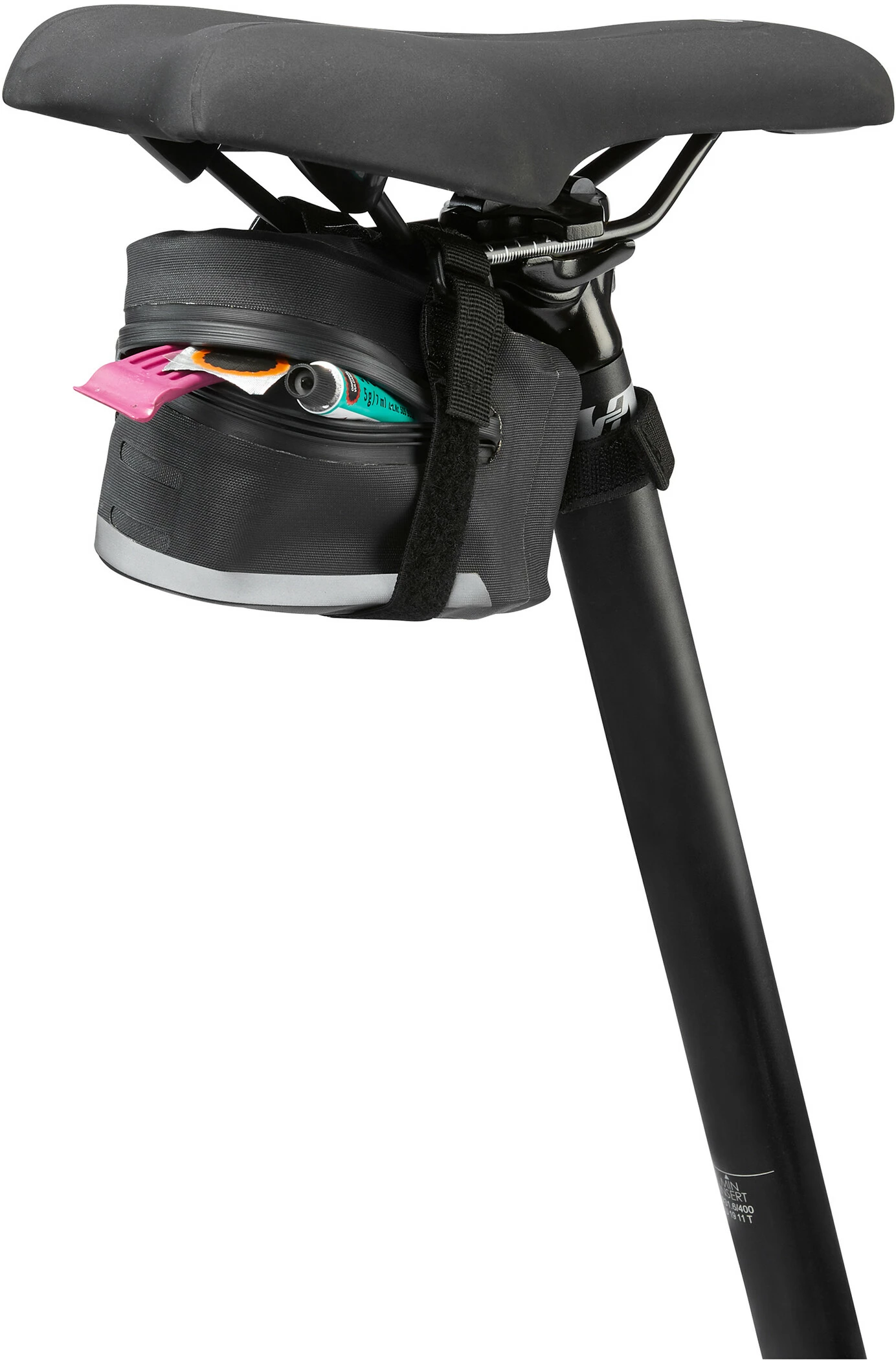 Die wasserdicht verschweißte Satteltasche Tool Aqua M bietet mit knapp 1 l Volumen Gravel- und Rennradfahrern genug Platz für Handy und Schlüssel oder für Werkzeug, Minipumpe und Ersatzschlauch. Die Tasche mit weiter Reißverschluss-Öffnung für schnellen Zugriff wird über ein optimiertes Klett-Befestigungssystem leicht und stabil unterm Sitz befestigt.