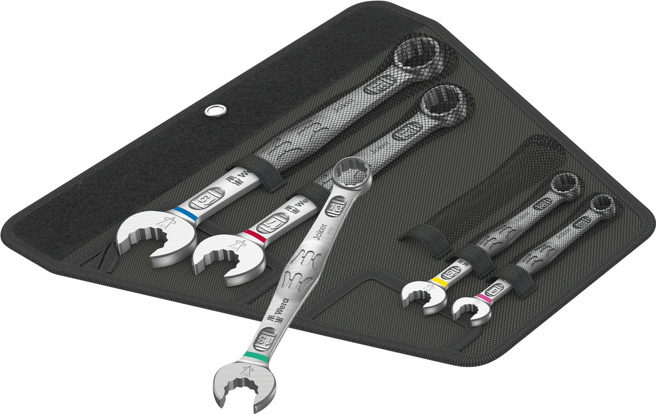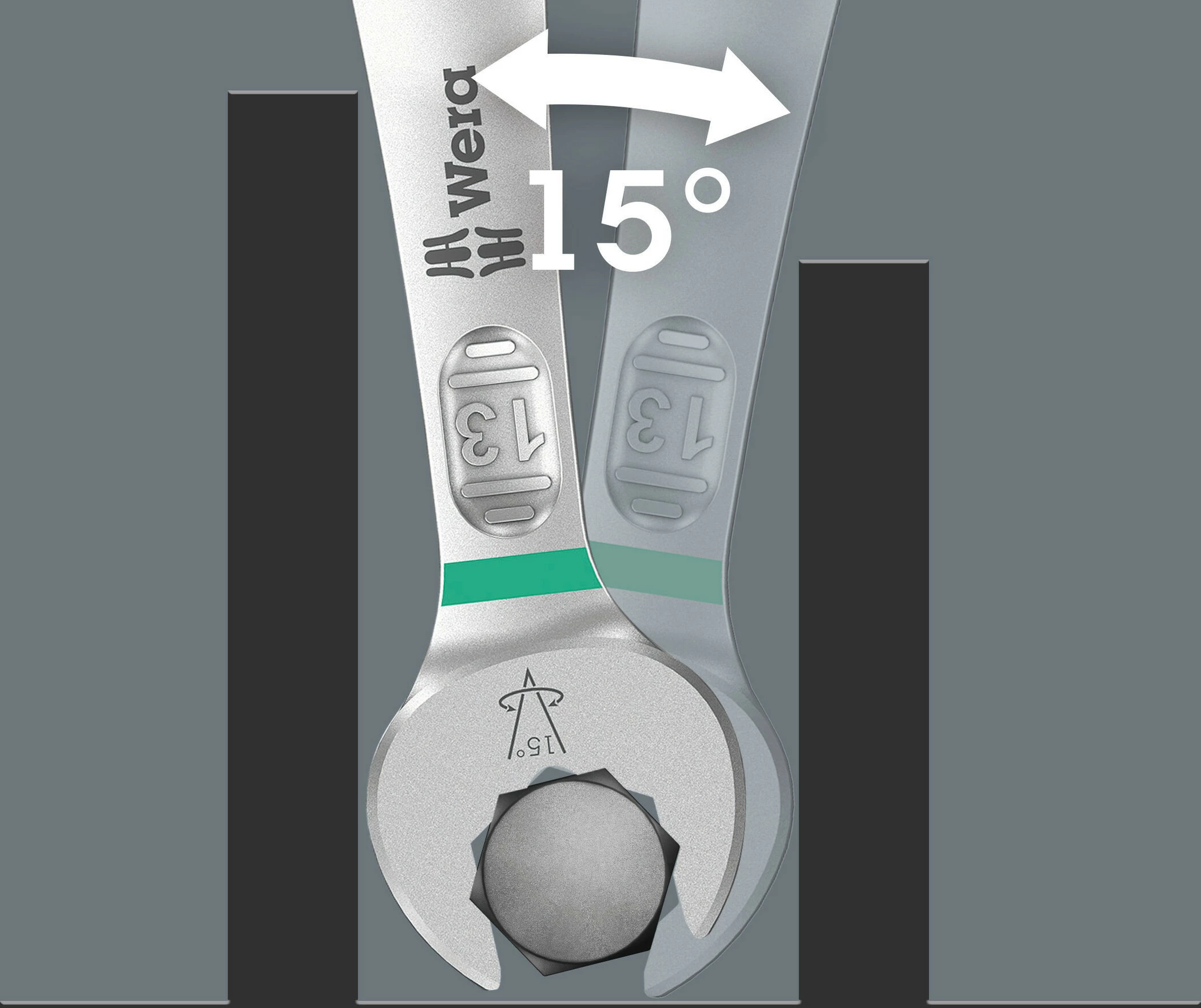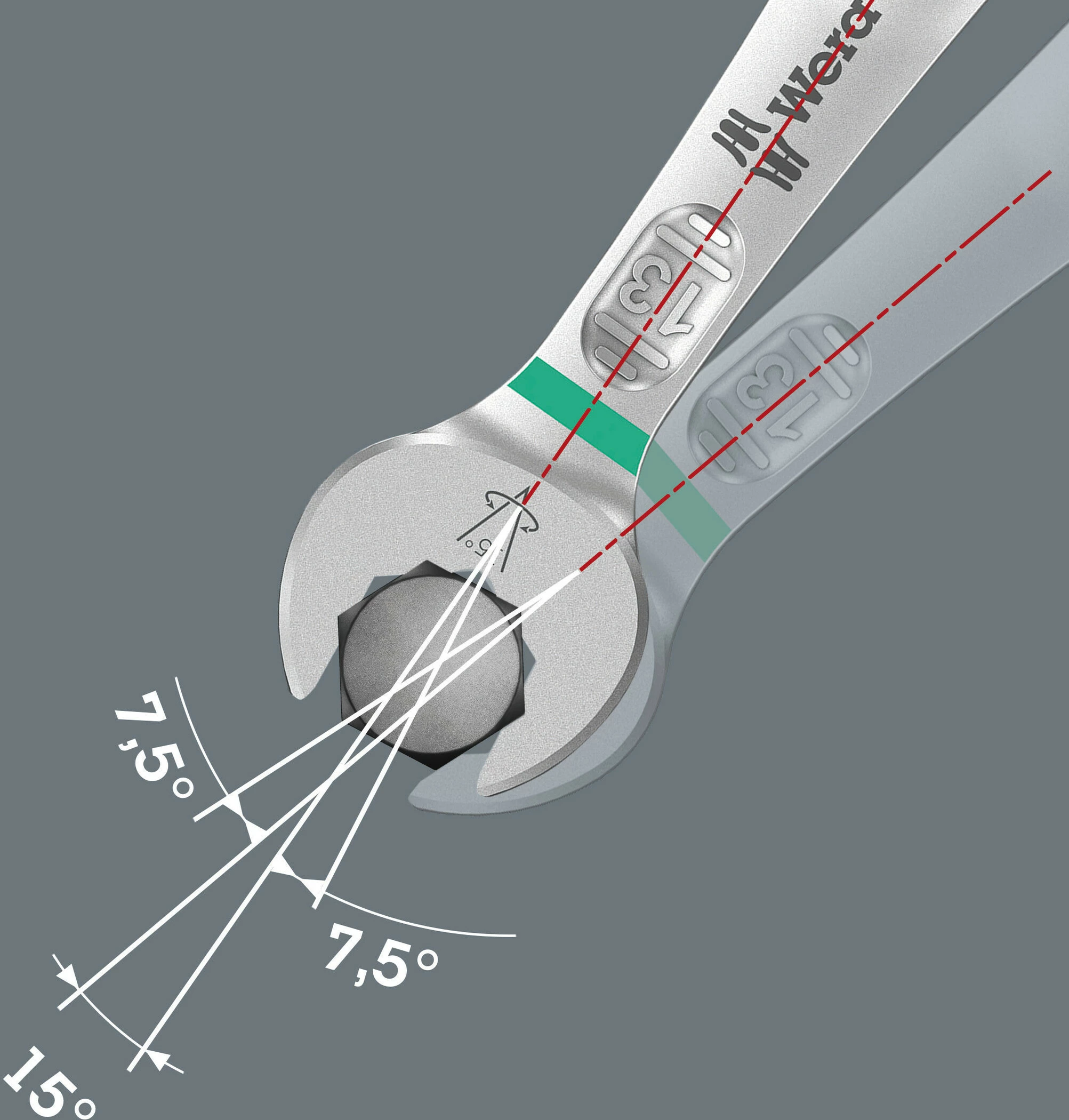 Da die Bauräume bei Schraubarbeiten immer enger werden, sind Werkzeuge notwendig, mit denen die Anwender auch in solchen Situationen erfolgreich arbeiten können. Enge Bauräume erfordern zusätzliche Ansetzpunkte des Werkzeugs. Lassen sich also Maulschlüssel derart modifizieren, dass sich die Ansetzmöglichkeiten des Werkzeugs erhöhen? Durch die Kombination des um 7,5° geschwenkten Mauls und die Doppelsechskantgeometrie wird eine Verdopplung der Ansetzpunkte erzielt. Bei einer wiederholten 180°-Drehung des Schlüssels um die Längsachse während des Schraubens gibt es vier Ansetzmöglichkeiten und Muttern bzw. Schraubenköpfe können alle 15° „gepackt” werden. Der Joker 6003 mit seiner pfiffigen Maulgeometrie erweitert das Anwenderspektrum in engen Bauräumen deutlich. Den jeweiligen Ansetzpunkt findet der Joker 6003 nach jedem Wenden sozusagen von selbst. Die schlanke und dennoch robuste Ringseite ist um 15° zur Werkzeugachse abgewinkelt. Durch die hochwertige Oberflächenvergütung wird ein hoher und lang anhaltender Korrosionsschutz erzielt. Mit Werkzeugfinder Take it easy: Farbkennzeichnung nach Größen. Die Joker Taschen sind durch das Klettsystem auf der Rückseite zur Befestigung an Wand, Regal, Werkstattwagen und am Wera 2go System geeignet.